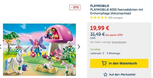 MyToys.de bietet aktuell das Playmobil 6055 - Feenwäldchen mit Einhornpflege für 19,99€ zzgl. 2,95€ Versand an. Äpfel können vom Baum gepflückt werden Grundplatte mit Pilz ca. 30 cm lang mit Verbänden Fee kann auf Einhorn reiten Teile: 109 Figuren: 1 Fee, 2 Feenkinder Tiere: 1 Einhorn, 2 Einhornfohlen, 1 Ente, 3 Entenküken, 1 Waldkauz, 2 Vögel Bei myToys wurde dieses Playmobil Set für Mädchen mit 5 Sternen beweret (10 Kundenrezensionen).