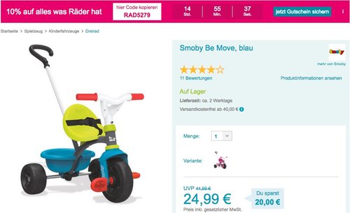 Babymarkt.de bietet heute, 09.04.18, als Tagesangebot das Dreirad von Smoby Be Move in Blau für 24,99€ und dank dem 10% Rabatt auf alles was Räder hat (Code: RAD5279) sogar für 22,49€ zzgl. 4,95€ Versand an. Schiebestange auf 3 Stufen verstellbar: 84 cm, 87 cm und 90 cm Mit Sicherheitsgurt Zuschaltbarer Pedalfreilauf Lenkblockierung Altersempfehlung: bereits geeignet für Kinder ab 15 Monaten Verstellbarer ergonomischer Sitz, passt sich auf 3 Stufen dem Körperbau an Inkl. Kippwanne Bei Amazon wurde dieses Dreirad mit 4 Sternen bewertet (17 Kundenrezensionen).