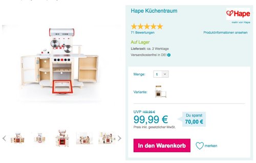 Babymarkt.de bietet heute, 12.02.18, als Tagesangebot die Hape Küchentraum Spielzeug-Küche in Weiß für 99,99€ inkl. Versand an. Mit einer Spielzeug-Küche können kleine Köche das Kochen ihrer Lieblingsrezepte imitieren oder im Teamarbeit mit Geschwistern oder Freunden das Essen für Teddy & Co vorbereiten. Hape Küchentraum:Material: Holz, Farbe auf Wasserbasis, Metal, PP Maße: 75,7 x 39,0 x 93,5 cm 5 Teilig Alter: ab 3 Jahren Diese Kinderküche wurde von Amazon Kunden mit sehr guten 4,4 Sternen benotet (85 Kundenrezensionen).