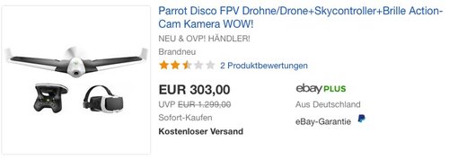 Price-guard bietet aktuell bei eBay die Parrot Disco FPV Drohne im Set mit Skycontroller und FPV-Brille NEU&OVP für 303€ inkl. Versand an. Parrot Disco FPV Drohne:Autopiloten unterstützte Steuerung/Flugplan 1080P Full-HD-Kamera mit digitalem 3-Achsen-Bildstabilisator Spannweite von 115 cm und Gewicht von 750 g 45 Minuten Akkulaufzeit 80 KM/H Höchstgeschwindigkeit Dieses erstklassige Spaßgerät wurde bei Amazon mit 3,6 Sternen bewertet (28 Kundenrezensionen).