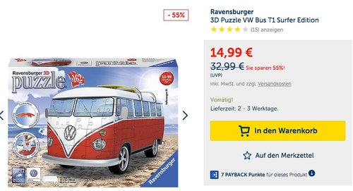 MyToys.de bietet bis zum 05.02.18 als "Knaller der Woche" das Ravensburger 3D Puzzle VW Bus T1 Surfer Edition für 14,99€ inkl. 2,95€ Versand an, solange der Vorrat reicht. Der originalgetreue Volkswagen T1 im Miniaturformat ist ca. 30 x 14 x 15 cm groß und besteht aus 162 stabilen Kunststoff-Puzzleteilen, inklusive Surfbrett und drehbaren Rädern.Bei Amazon wurde dieses witziges 3D Puzzle für alle Liebhaber des T1 mit 2,7 Sternen bewertet (133 Kundenrezensionen).
