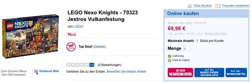 In der Vulkanfestung gibt es einen abnehmbaren Thron, einen Scheibenwerfer mit Sitz, eine Falltür-Funktion und ein Treppenhaus mit rotierendem Sägeblatt. Anzahl der Teile: 1186. 4,9 Sterne bei Amazon (21 Bewertungen).