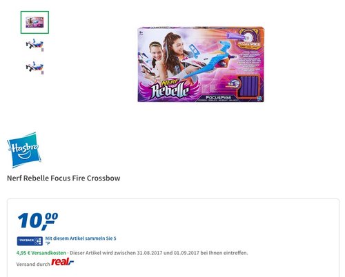 Nerf Rebelle Focus Fire Crossbow ist ein Armbrust-Blaster für Rebellinnen, die den Fokus auf Präzision und Style legen. Aus der rotierenden Trommel werden die speziellen AccuStrike Darts zielgenau auf die Reise geschickt. Enthält 5 AccuStrike Darts für treffsicheren NERF Rebelle Spaß. 5 Sterne bei Amazon (2 Bewertungen).