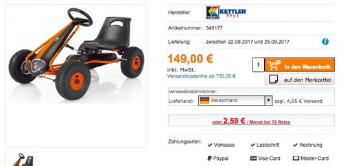 Kettler Kettcar Suzuka Air schwarz/orange hat ein echtes KETTCAR! Qualität und wurde in Deutschland hergestellt. Altersempfehlung: 4 bis 8 Jahren und für Körpergröße 100 - 130 cm geeignet. Höchstgewicht: 50 kg.