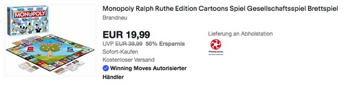 Cityedition bietet aktuell bei eBay das Monopoly Ralph Ruthe Edition - Brettspiel NEU&OVP für 19,99€ inkl. Versand an, solange der Vorrat reicht. Der beliebte Brettspielklassiker in der bunt-verrückten Edition des beliebten Cartoonisten und Comiczeichners Ralph Ruthe für 2 - 6 Spieler Dieses Brettspielklassiker mit Ruthe Cartoons wurde von Amazon Kunden mit sehr guten 4,8 Sternen benotet (32 Sternebewertungen).
