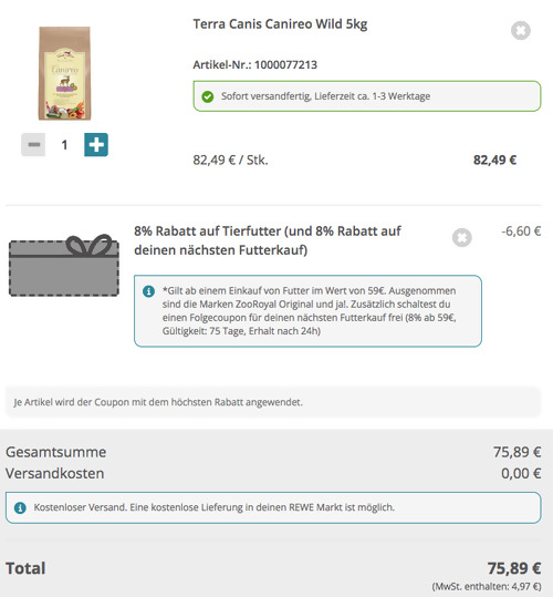 ZooRoyal.de bietet bis 01.02.2026 einen 8% Rabatt auf ausgewähltes Tierfutter, gilt ab 59€ und exklusiv für ZooRoyal Club Mitglieder (Anmeldung kostenlos) und solange der Vorrat reicht.Das Terra Canis Hunde-Trockenfutter "Canireo Wild" 5 kg bekommt man im Laufe dieser Aktion für 75,89€ inkl. Versand. Trockenfutter für ausgewachsene Hunde als Alleinfutter geeignet mit frischem Muskelfleisch und Leber von Reh und Hirsch Frisches Muskelfleisch von Reh und Hirsch (64 %), Kartoffelflocken (12 %), Kokosmehl (4,8 %) ... Rohstoffe in Lebensmittelqualität Rezeptur mit Tierärzten entwickelt hohe Qualität aus Deutschland