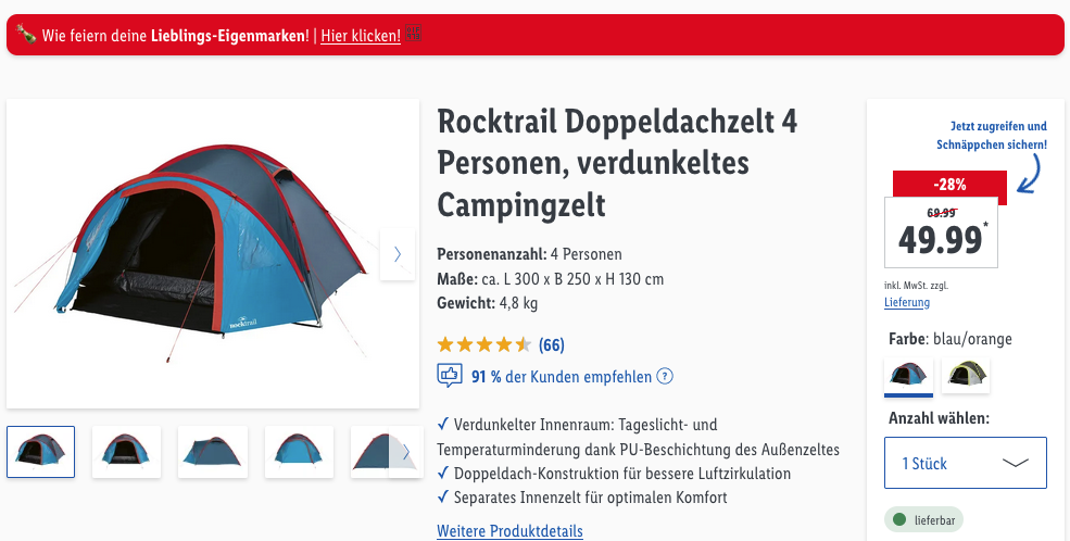 Das Rocktrail 4 Personen verdunkelte Campingzelt in Blau/Orange oder Grau/Gelb bekommt man im Laufe dieser Aktion für 49,99€ zzgl. 5,95€. Versand.