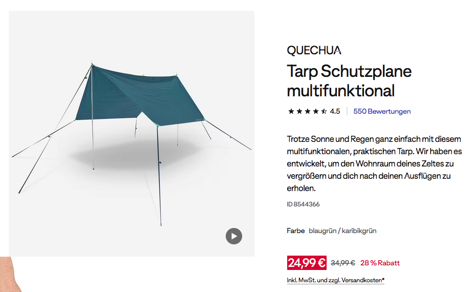 Die QUECHUA Tarp Schutzplane multifunktional bekommt man im Laufe dieser Aktion für 24,99€ zzgl. 4,99€ Versand, Filialabholung ist versandkostenfrei.