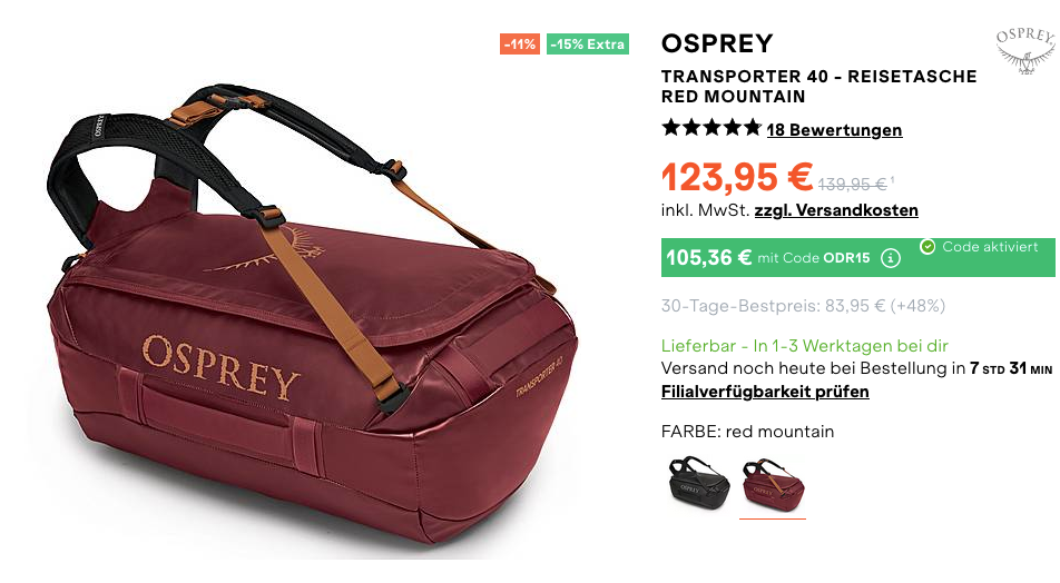 Den Osprey Transporter 40 in Red Mountain bekommt man im Laufe dieser Aktion für 105,36€ zzgl. 4,50€ Versand.