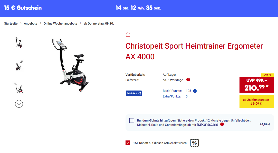 Den Christopeit Sport Heimtrainer Ergometer AX 4000 bekommt man im Laufe dieser Aktion für 195,99€ zzgl. 5,95€ Versand.