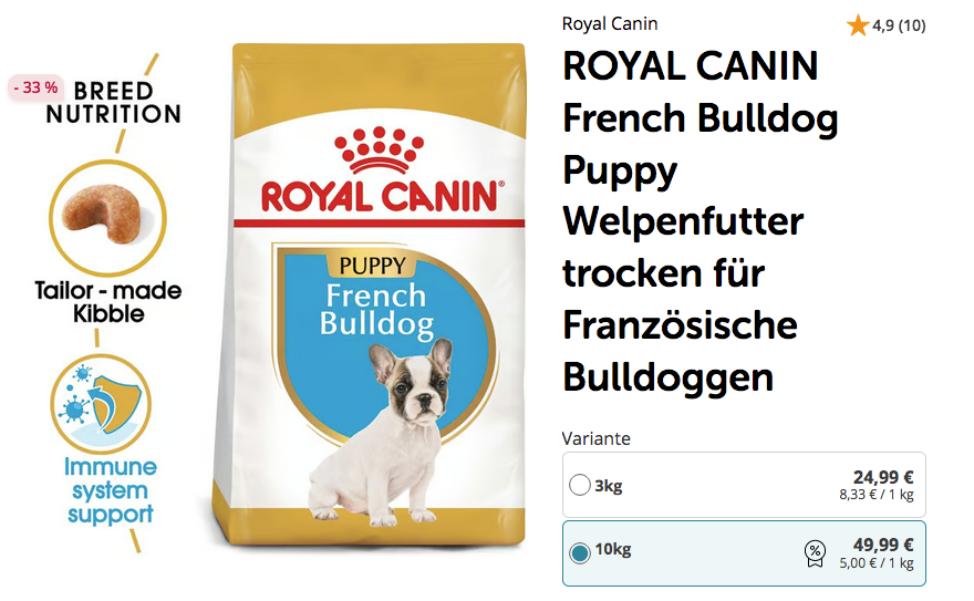 Das ROYAL CANIN 10 kg French Bulldog Puppy Welpenfutter trocken für Französische Bulldoggen bekommt man im Laufe dieser Aktion für 49,99€ Versand.