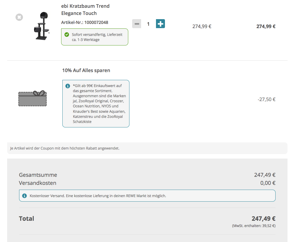 Den ebi Kratzbaum Trend Elegance Touch bekommt man im Laufe dieser Aktion für 247,49€ inkl. Versand.