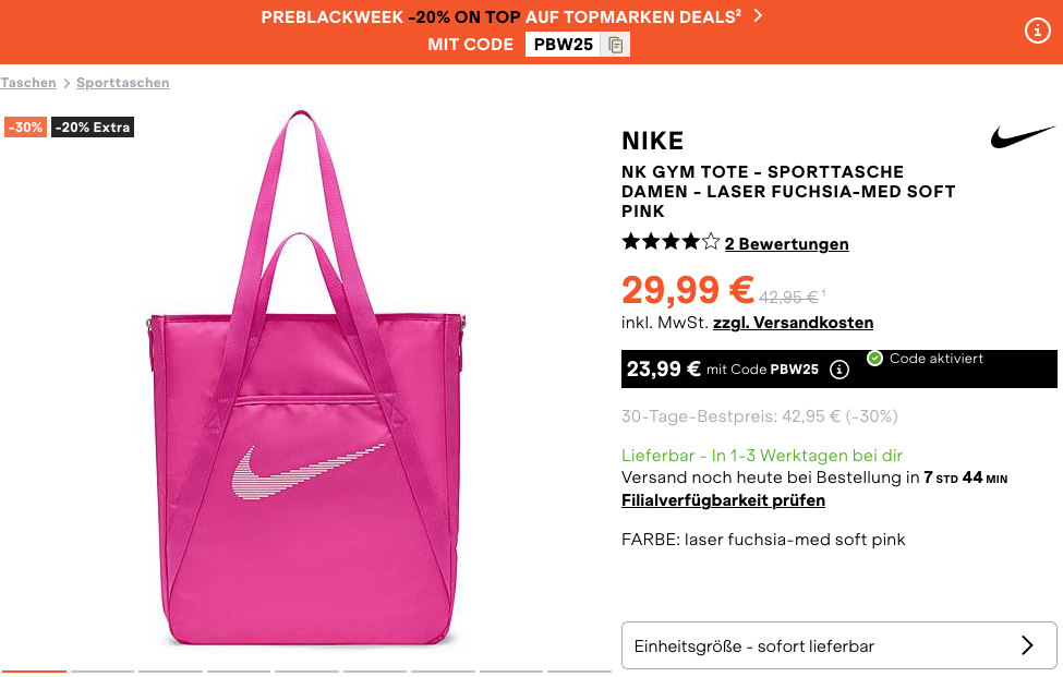 Die Nike GYM TOTE Sporttasche in Laser Fuchsia-Med Soft Pink bekommt man im Laufe dieser Aktion für 23,99€ zzgl. 4,50€ Versand.
