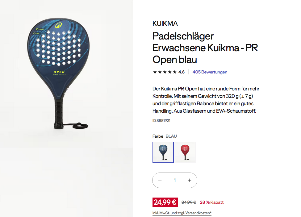Den KUIKMA PR Open Erwachsene Padelschläger in Blau oder Rot - Tagesdeal am 21.11.25 - bekommt man im Laufe dieser Aktion für 24,99€ zzgl. 4,99€ Versand, Filialabholung ist versandkostenfrei.