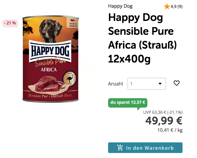 Die Happy Dog Sensible Pure Africa (Strauß) 12x400g Nassnahrung bekommt man im Laufe dieser Aktion für 49,99€ inkl. Versand.
