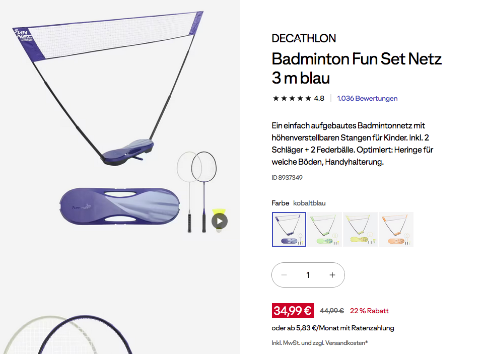 Das DECATHLON Badminton Fun Set Netz 3 m in verschiedenen Farben bekommt man im Laufe dieser Aktion für 34,99€ zzgl. 4,99€ Versand, Filialabholung ist versandkostenfrei.