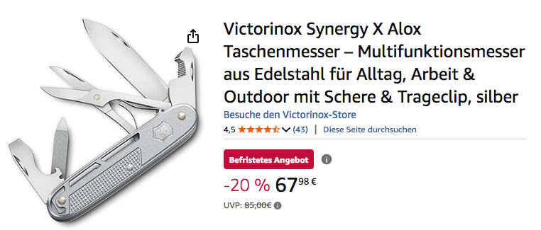 Amazon bietet aktuell das Victorinox Synergy X Alox Taschenmesser in Silber für 67,98€ an, solange der Vorrat reicht.