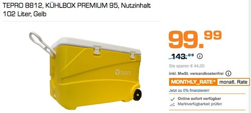Saturn bietet bis Mi. 02.05., 9 Uhr im Laufe der - Late Night Shopping XXL - Aktion ausgewählte Artikel billiger an, versandkostenfrei und solange der Vorrat reicht.Die TEPRO 8812 KÜHLBOX PREMIUM 95, Nutzinhalt 102 Liter, Gelb bekommt man im Laufe dieser Aktion für 99,99€. Extra dicke PU-Vollschaumisolierung Kühlleistung bis zu 32 Stunden ohne Kühlelemente (ca. 10°C Temperaturanstieg bei ca. 32°C Umgebungstemperatur) Kühlelement im Lieferumfang enthalten 2-Liter-Flaschen können stehend transportiert werden fahrbar durch stabile Räder Höhe: 520 mm Tiefe: 465 mm Breite: 832 mm Eine Kühlbox ist unverzichtbar bei allen Outdoor-Aktivitäten wie: Grillen, Picknicken oder Zelten.